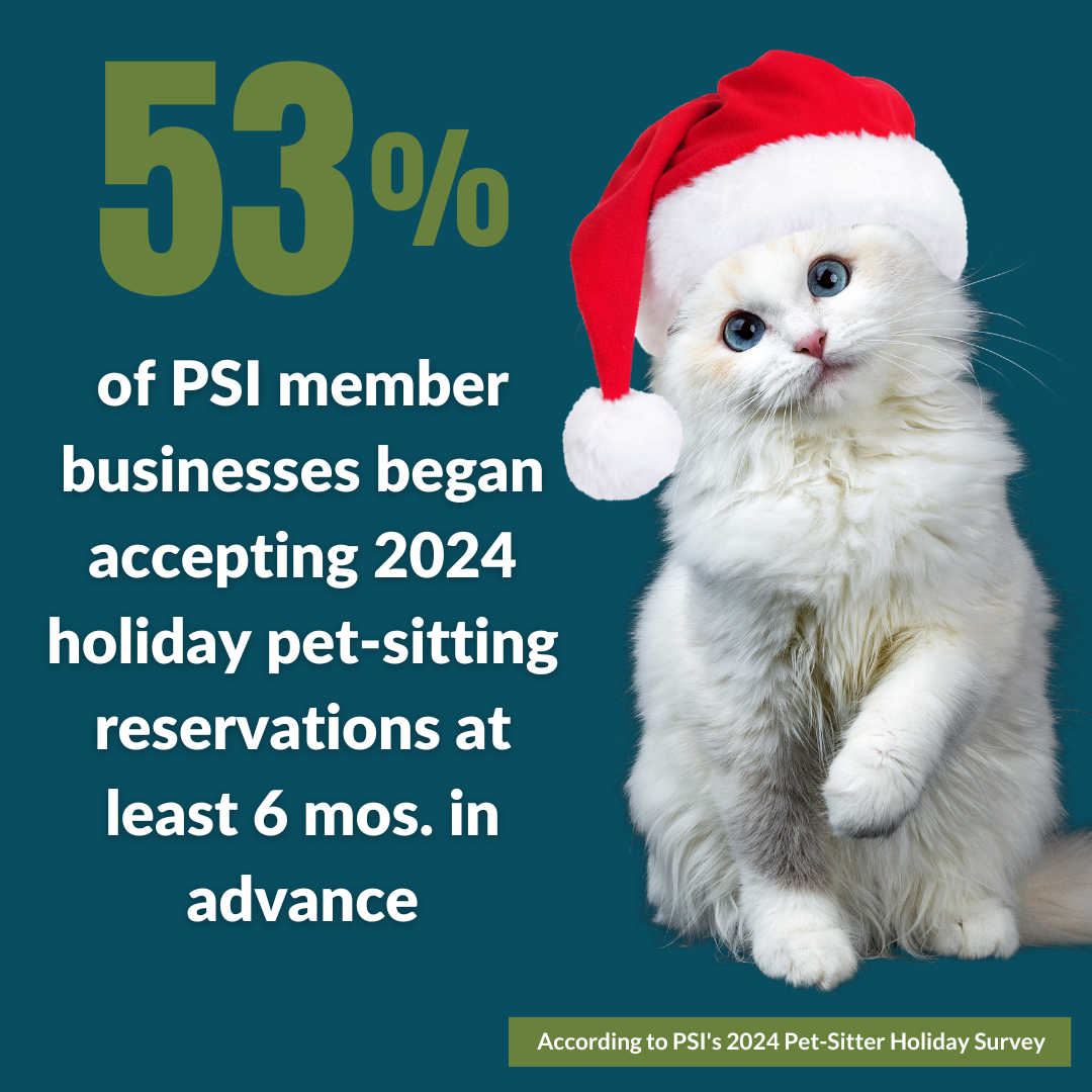 PSI, the world’s largest educational association for professional pet sitters and dog walkers, recently surveyed more than 450 member businesses and found that more than half of respondents (53%) said they began accepting holiday pet-sitting reservations at least six months in advance for the 2024 holiday season (late November through early January). Only 13 percent said reservations had not started yet as of mid-September, when the survey was conducted.
