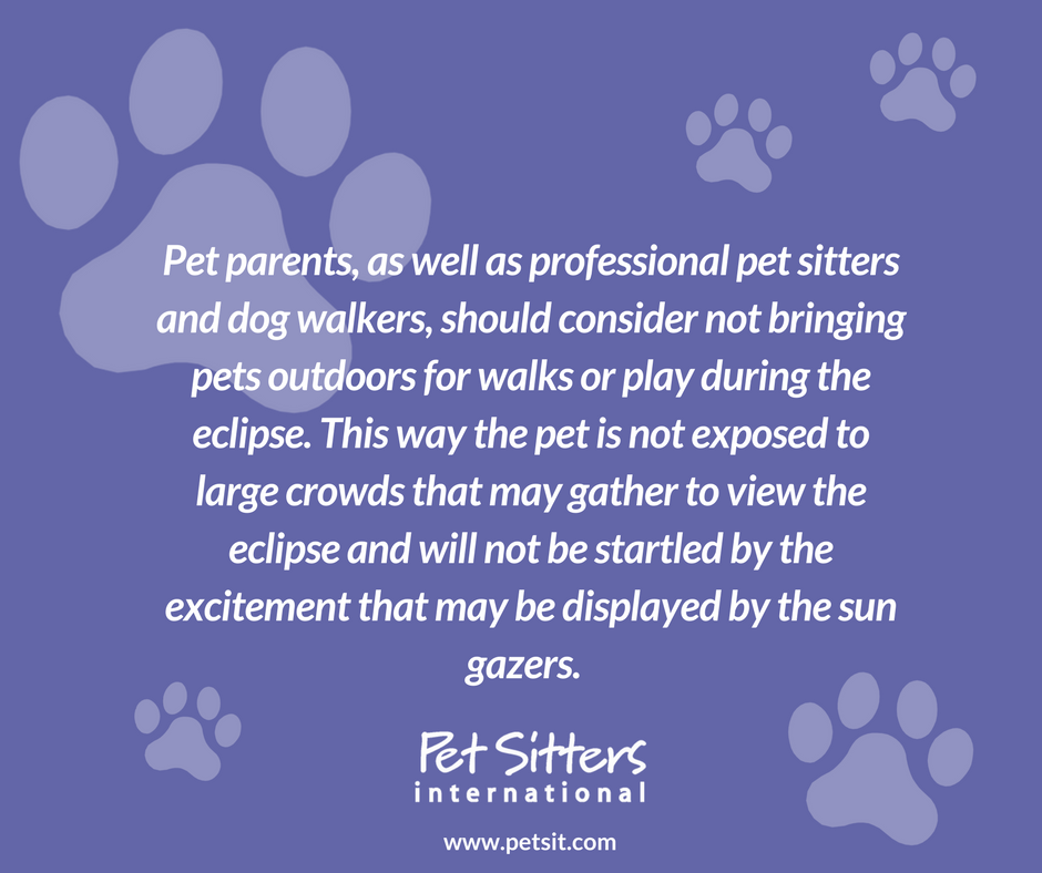 While damage to pets’ eyes are unlikely, pet parents, as well as professional pet sitters and dog walkers, should consider not bringing pets outdoors for walks or play during the eclipse. Keep pets indoors with windows closed and shades or curtains drawn.